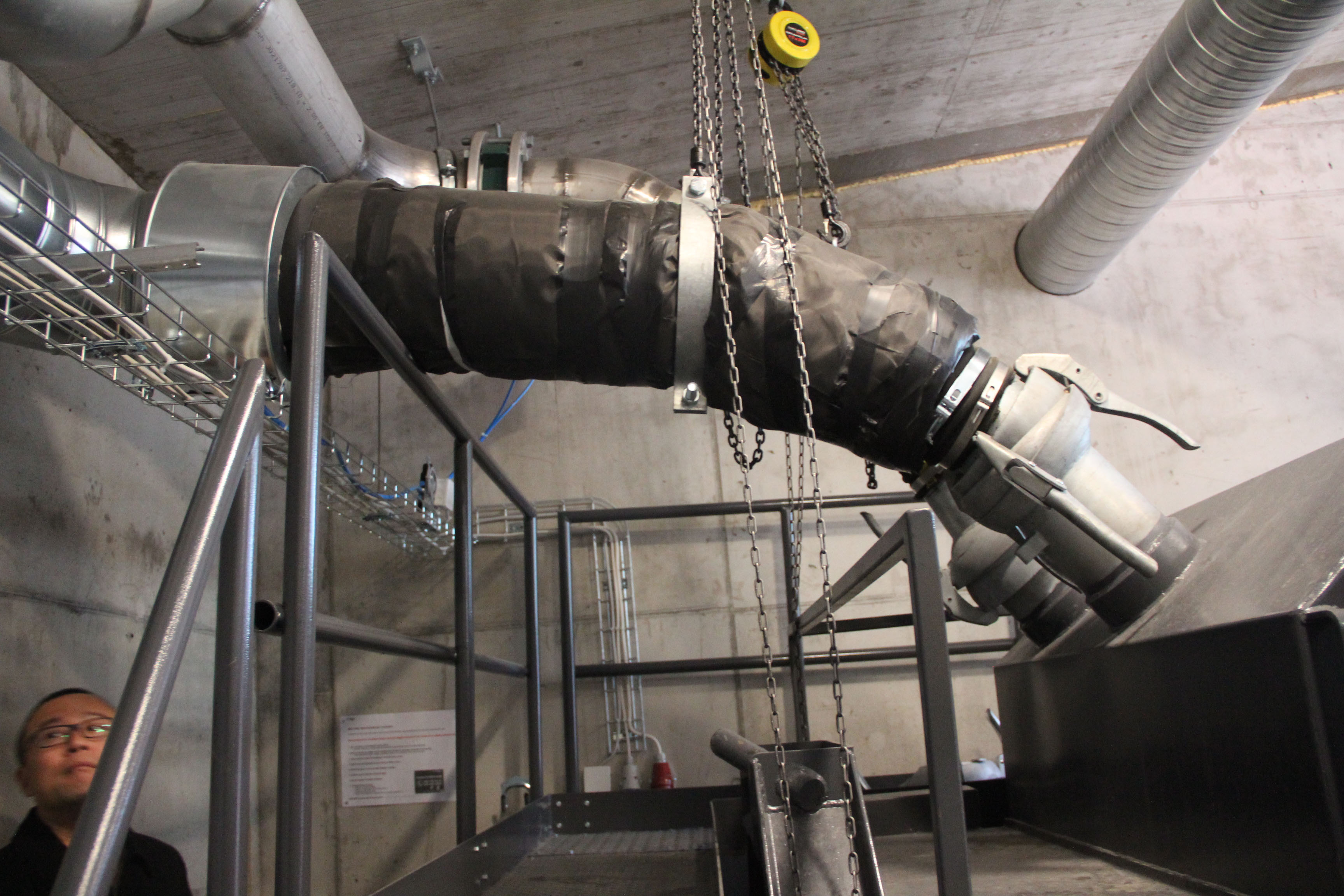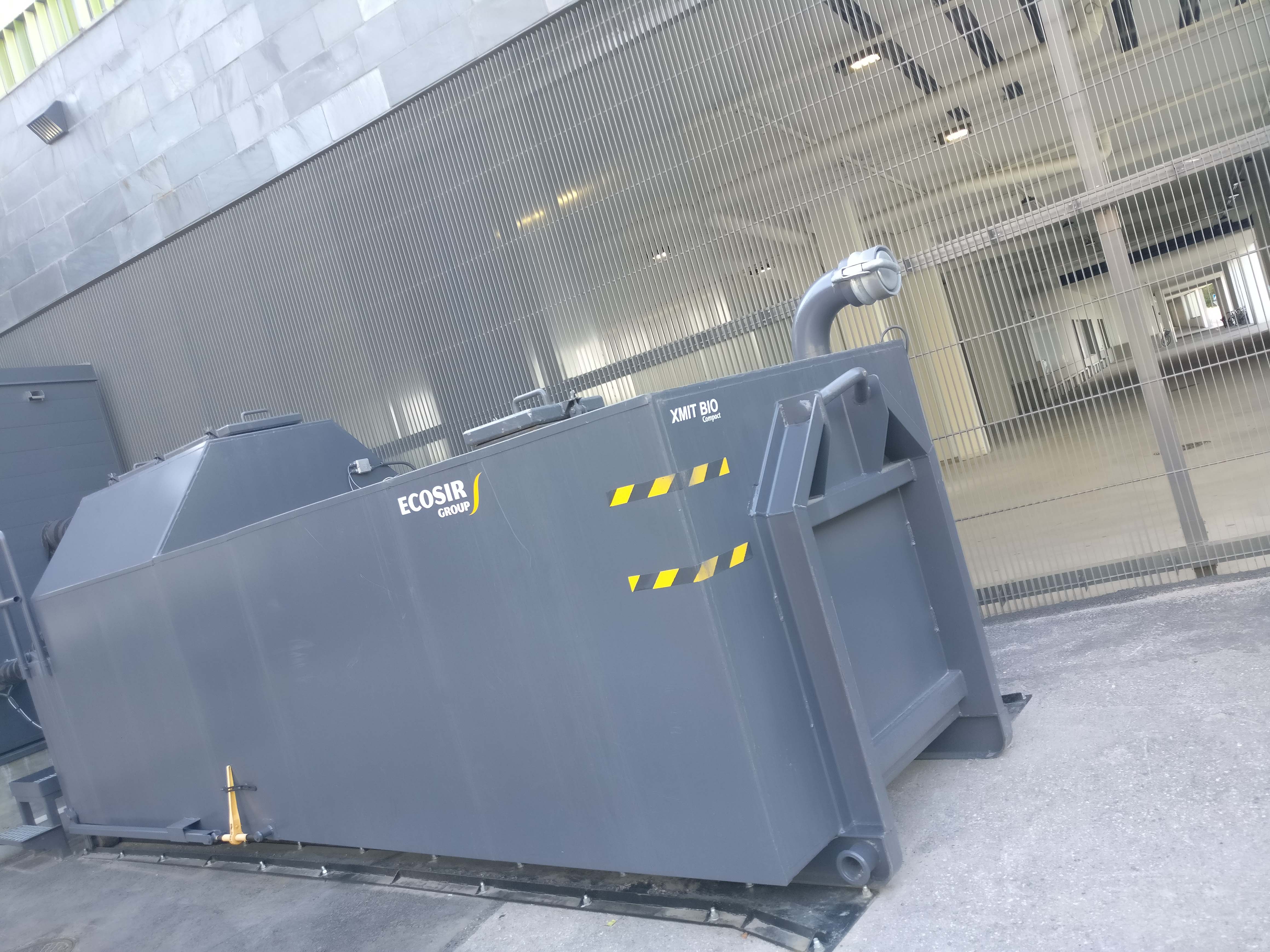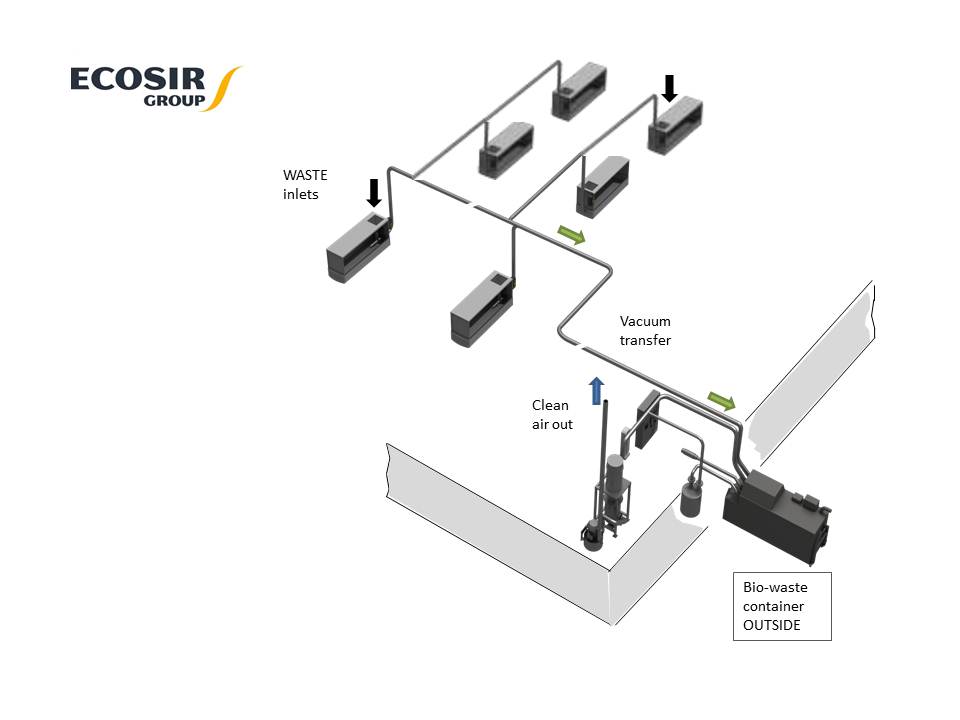 利用真空原理吸入到中央垃圾房内的处理设备中通过进行粉碎、油水分离、脱水、废气排放等工序,最后处理完的厨余垃圾由设备的垃圾排放口排出。
